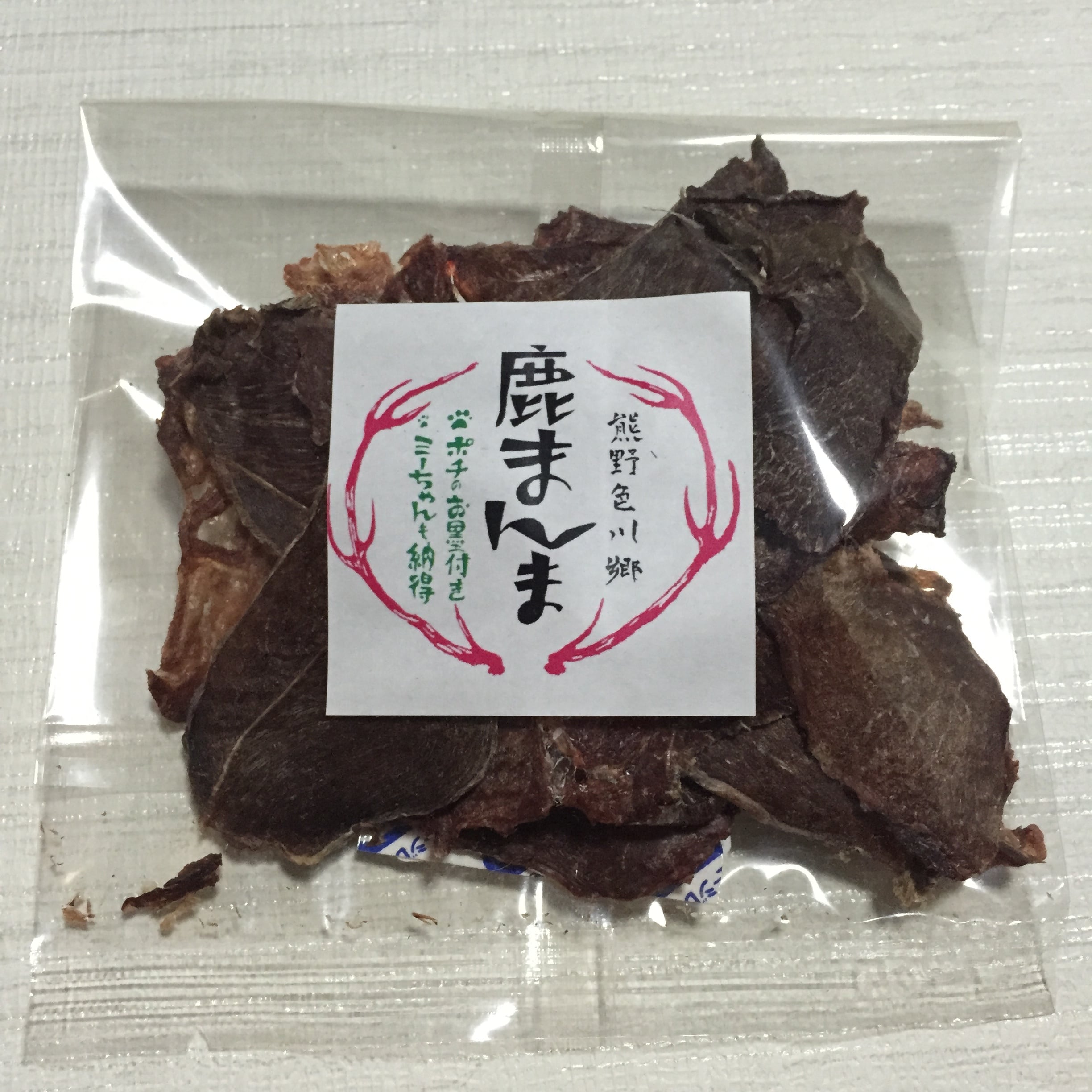 鹿肉は高タンパク・低脂肪・低カロリー。鉄分やビタミンを多く含み、リノール酸、αリノレン酸、DHAも含有しているお肉です。しかも牛肉や豚肉、鶏肉などの家畜と違って、野生の鹿は抗生物質やホルモン剤、添加物などを与えられずに育ちます。このため、重度のアトピー症状とたたかう方々も、食事療法の指導者に鹿肉を薦められているのです。そんな健康的なお肉は、わんこ・にゃんこも大よろこび。鹿まんまはスライスした生肉をじっくりと低温乾燥させて作った犬猫用鹿ジャーキーです。